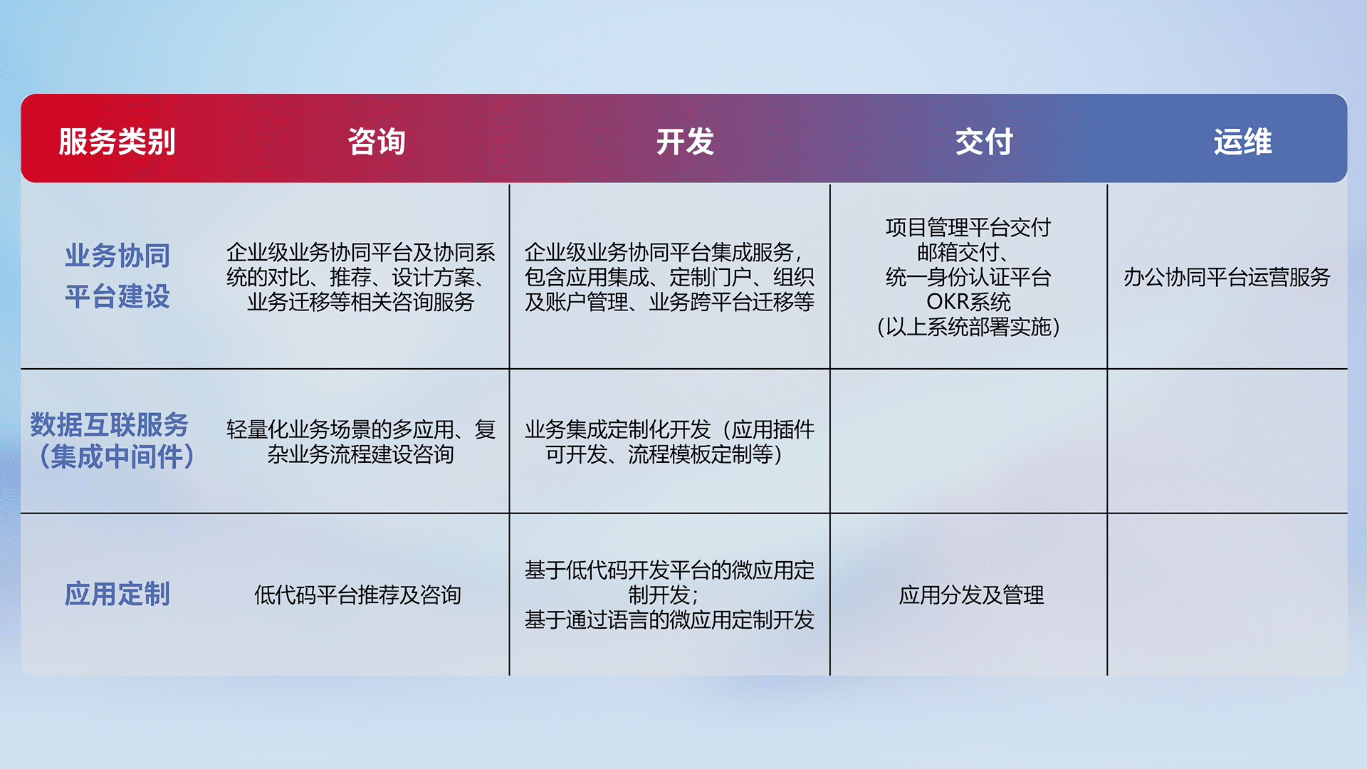 针对钉钉、、企微、、、IDaas等平台级产品提供产品的规划、、、方案、、、交付、、定制化开发等服务,,,实现如统一协同办公、、智能客户服务、、、混合会议管理、、、、智能数据查询、、、、等业务场景,,,,实现数字化转型。。。。